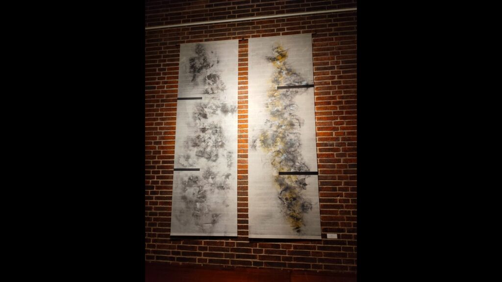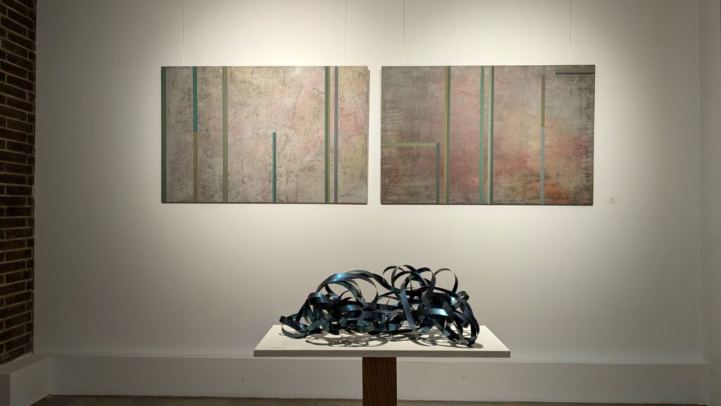 As I stand before “Watermark,” I’m immediately drawn into its depths. Delicate glazes reveal vertical abstractions crafted through fine drips, imaginative sprays, and generous spatula work. These elements are punctuated by upright bands of precise lines, creating a rhythm that guides the eye.